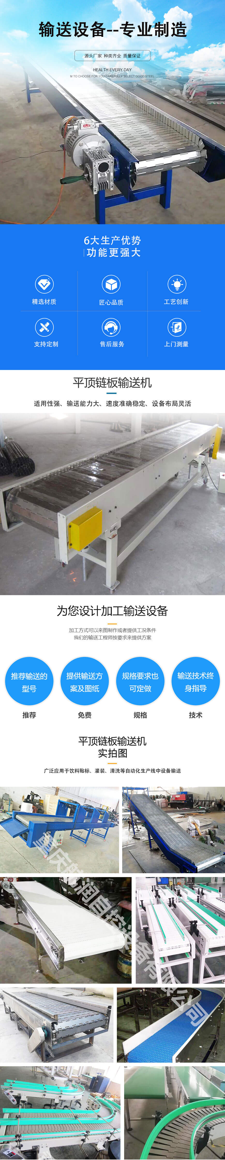 平頂鏈板輸送機(jī)是由馬達(dá)減速機(jī)為動(dòng)力、以標(biāo)準(zhǔn)平頂鏈為承載面?zhèn)鲃?dòng)的輸送設(shè)備。設(shè)備適用性強(qiáng)、輸送能力大、速度準(zhǔn)確穩(wěn)定、布局靈活、結(jié)構(gòu)簡(jiǎn)單,維護(hù)方便。廣泛應(yīng)用于飲料貼標(biāo)、灌裝、清洗等自動(dòng)化生產(chǎn)線中設(shè)備輸送。 材質(zhì):碳鋼、不銹鋼、熱塑鏈; 規(guī)格: 直輸鏈板寬度(mm)有63.5、82.5、101.6、114.3、152.4、190.5、254、304.8; 轉(zhuǎn)彎鏈板寬度(mm)有82.5、114.3、152.4、190.5、304.8。